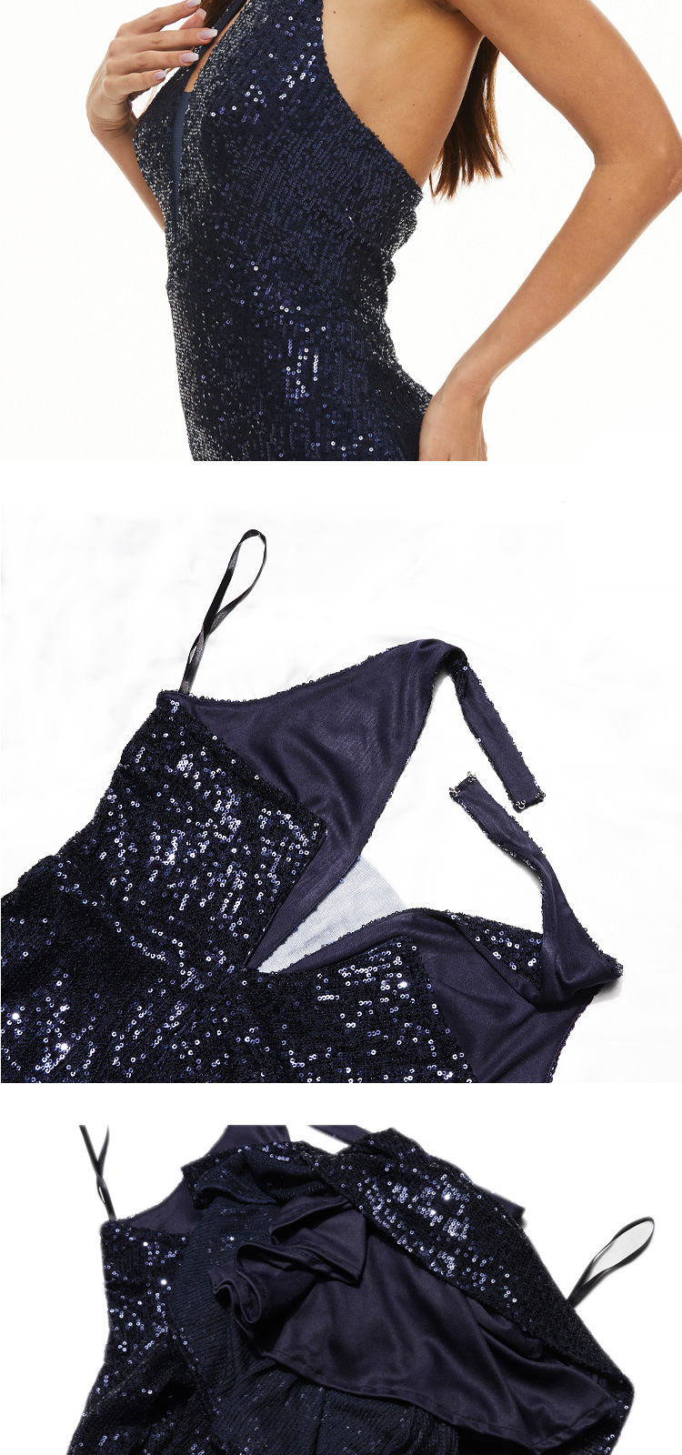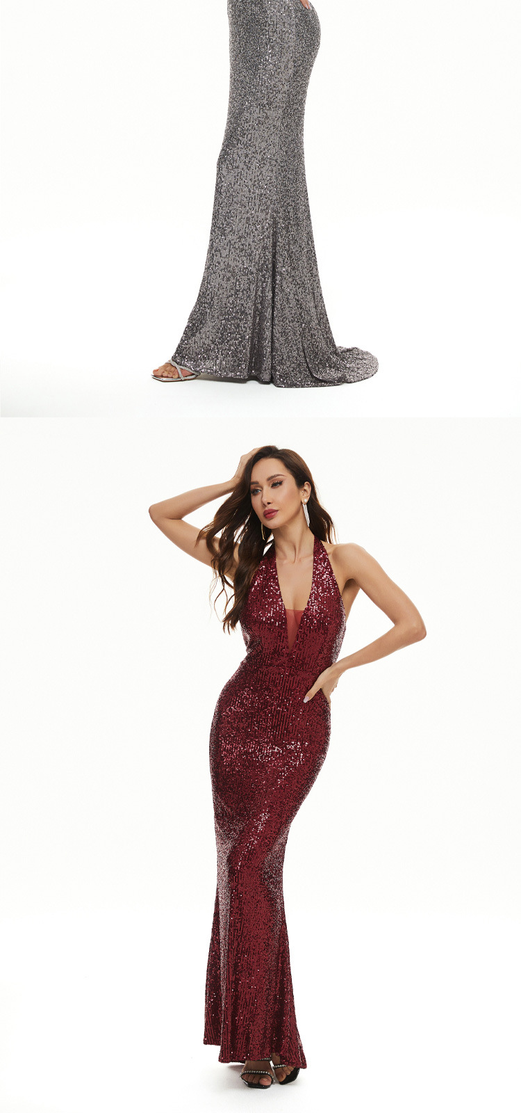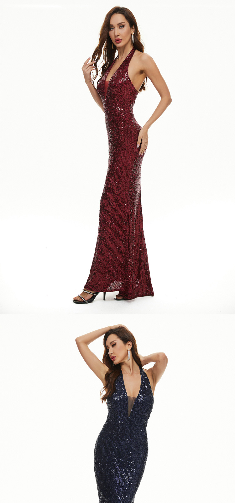 Women’s Sequined Evening Gown – Deep V-Neck Strap, Luxury Banquet Dress